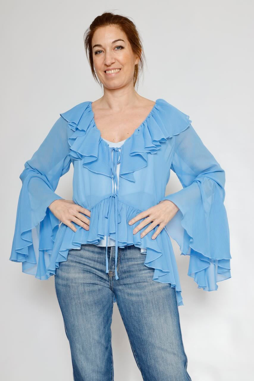 Esta blusa azul en tono Azzurro es el complemento perfecto para tu guardarropa. Con un diseño elegante y femenino, esta blusa destaca por sus detalles de lazadas en la parte delantera y mangas acampanadas.