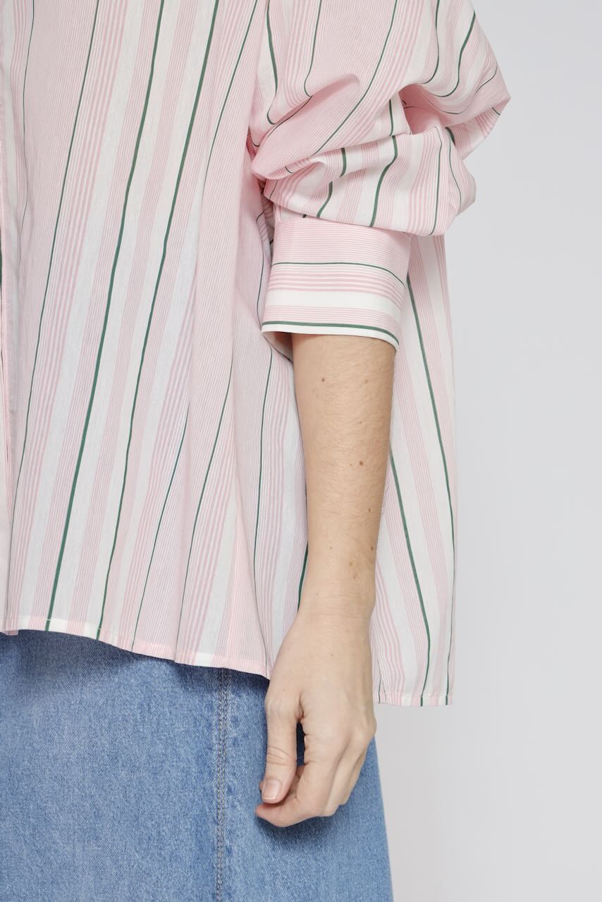 Esta elegante camisa a rayas en tonos rosa y verde es perfecta para añadir un toque de color a tu outfit.