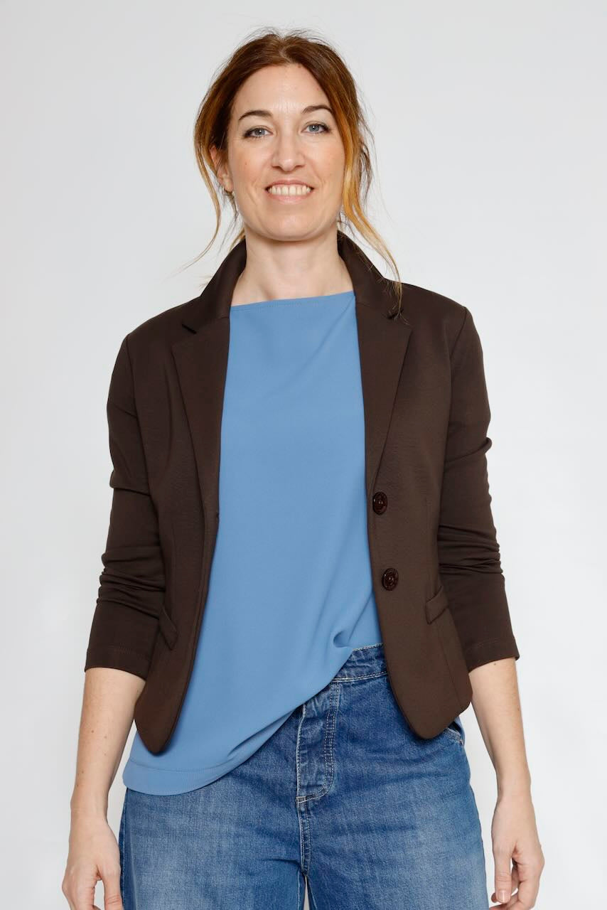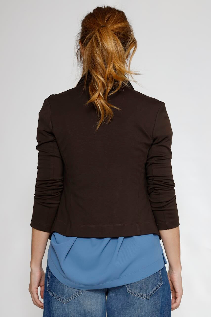 Esta americana de punto roma en color marrón es la prenda perfecta para completar tu outfit en cualquier ocasión. Con un diseño elegante y versátil, te brinda comodidad y estilo a partes iguales.