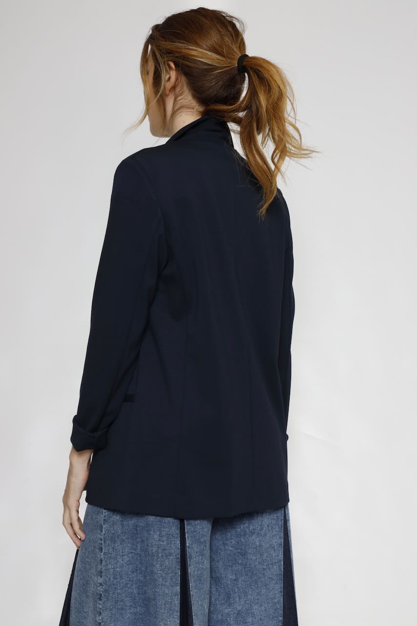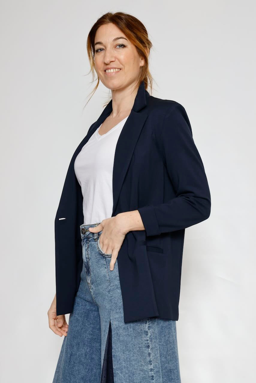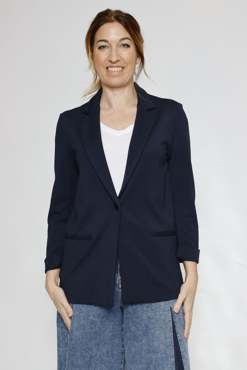 La americana oversize está compuesta por un 62% de viscosa, un 32% de poliamida y un 6% de elastano para un ajuste cómodo y flexible.