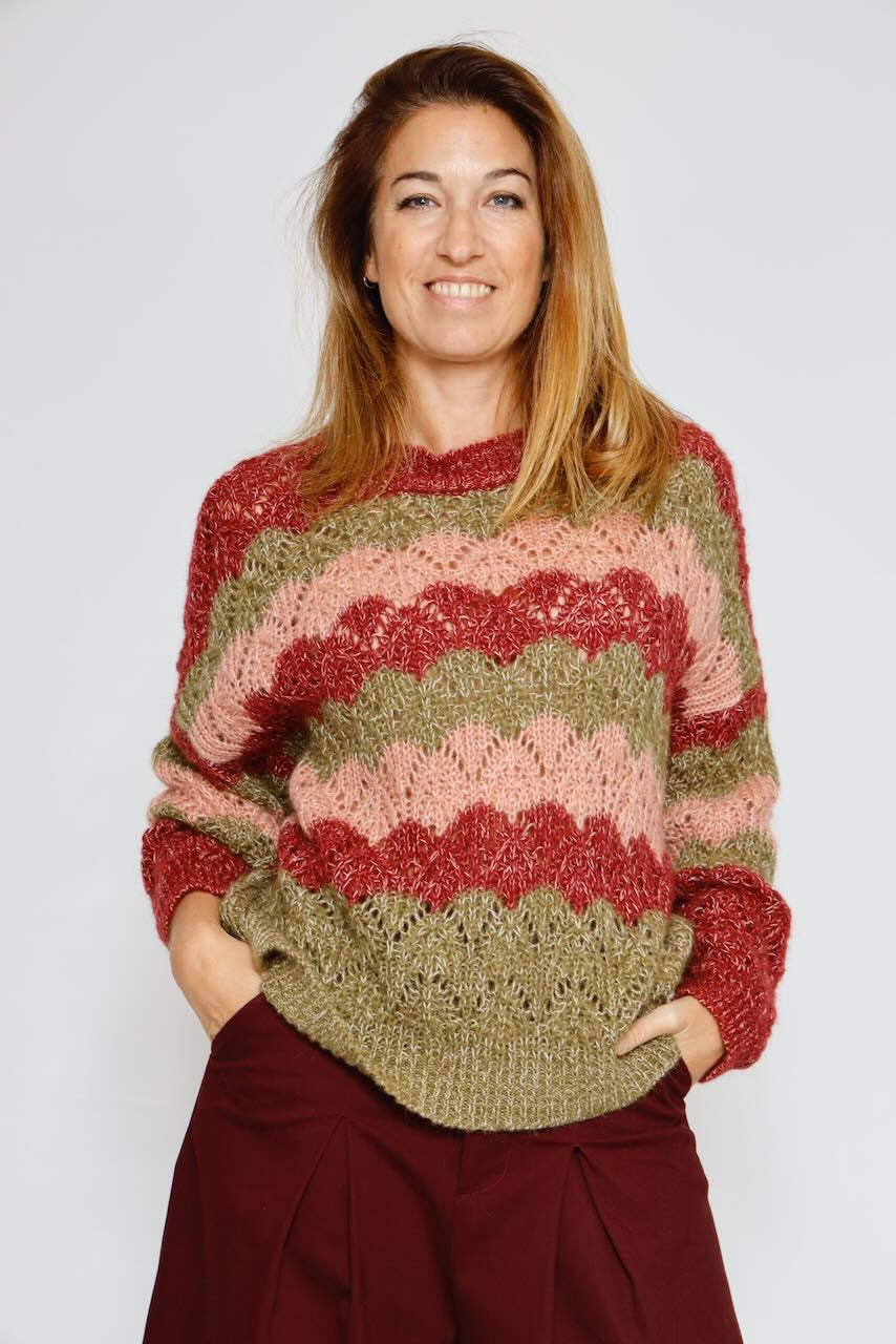 El jersey BY09060-MULTICOLOR es una prenda moderna y versátil que combina tonalidades granates y verdes en un diseño único y llamativo.