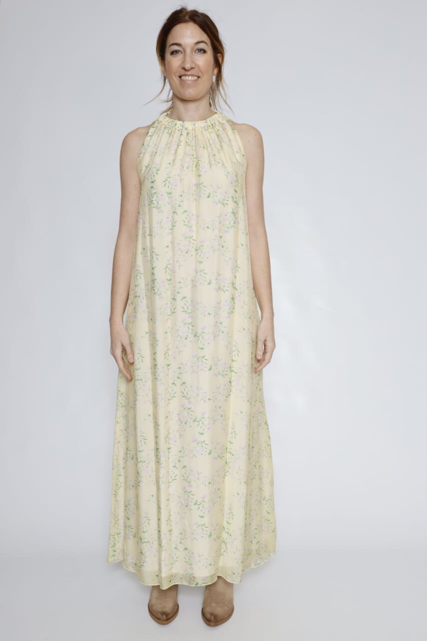 El vestido largo en color amarillo con estampado de florecitas rosas es una prenda elegante y femenina perfecta para cualquier ocasión.