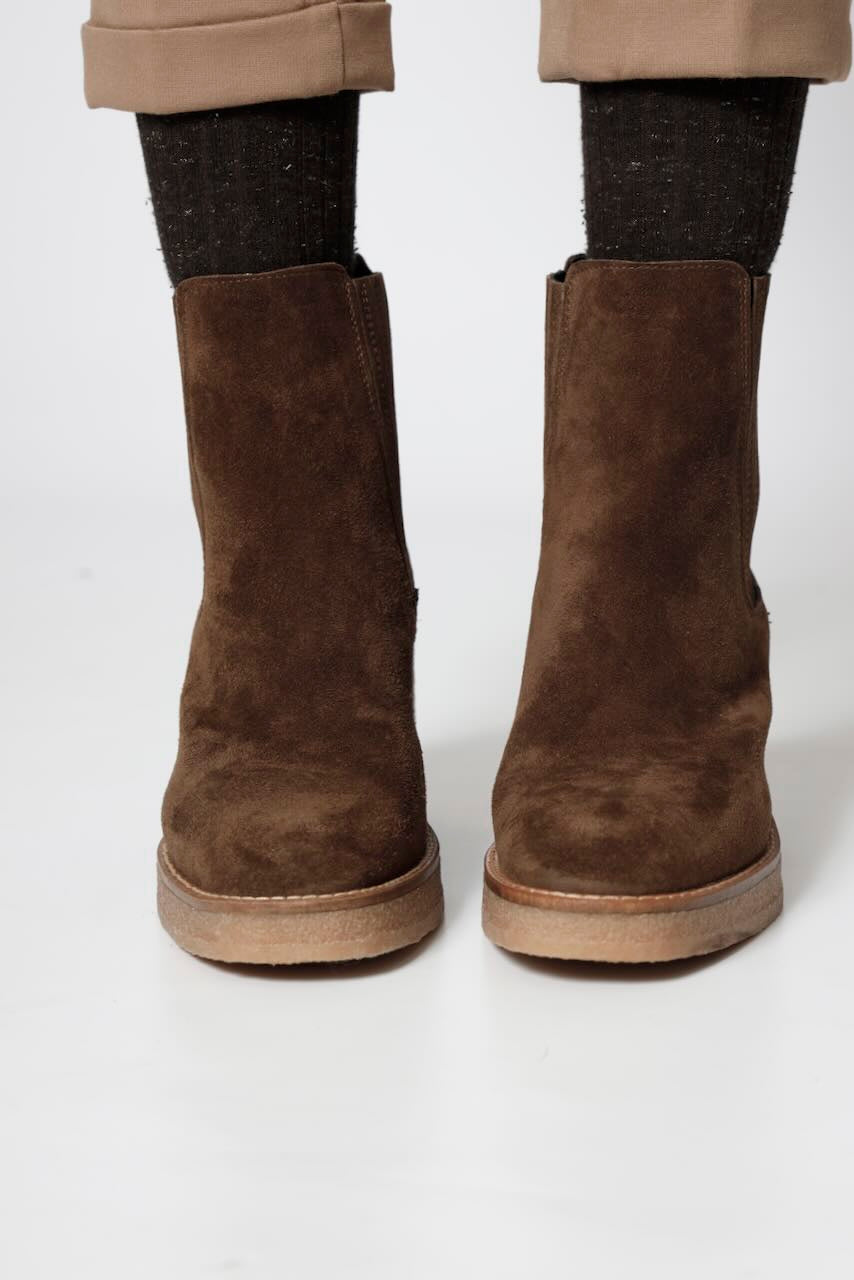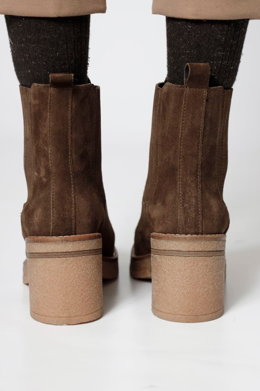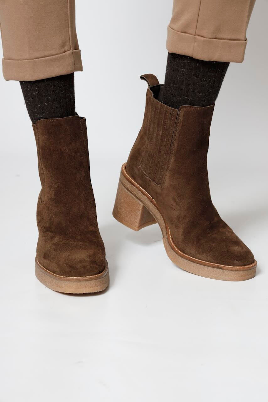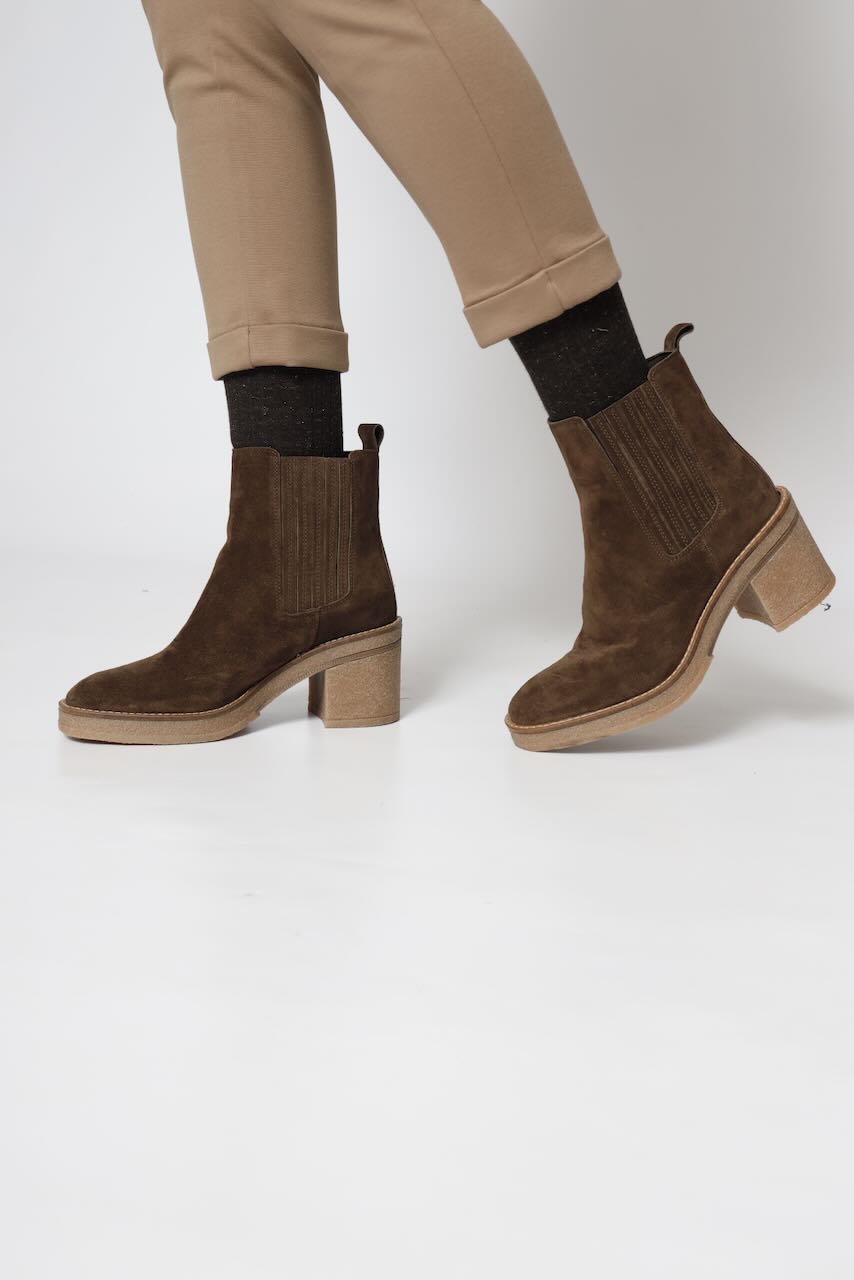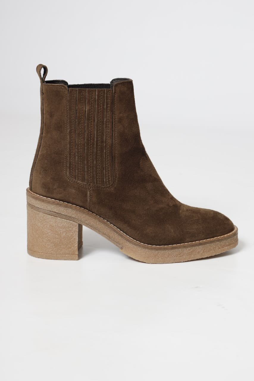 Botin elaborado en piel ( baby silk) de color mustang con tacón de 7, 5 cm, suela antideslizante y puntera redonda, sin cierre y caña baja.