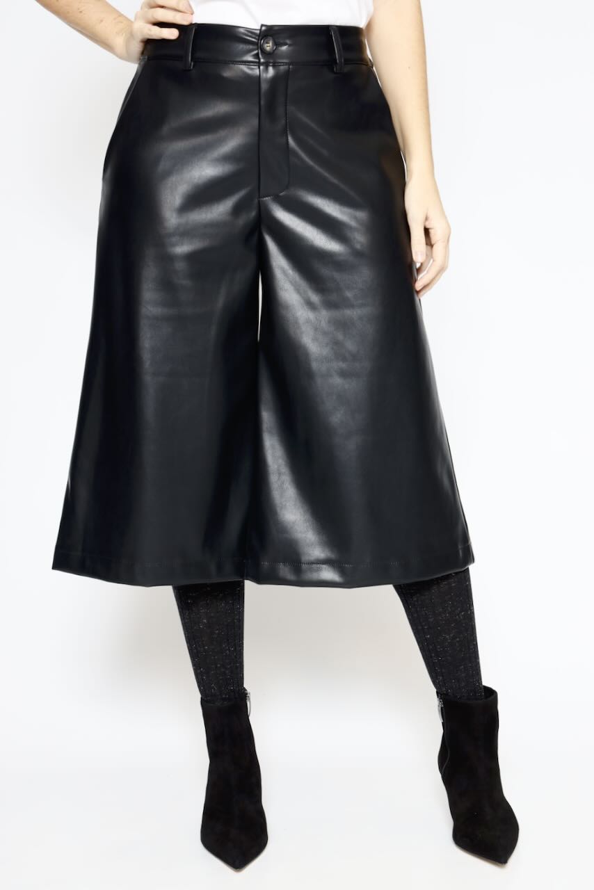 El pantalón negro efecto polipiel es una prenda elegante y versátil que se adapta a diferentes ocasiones.