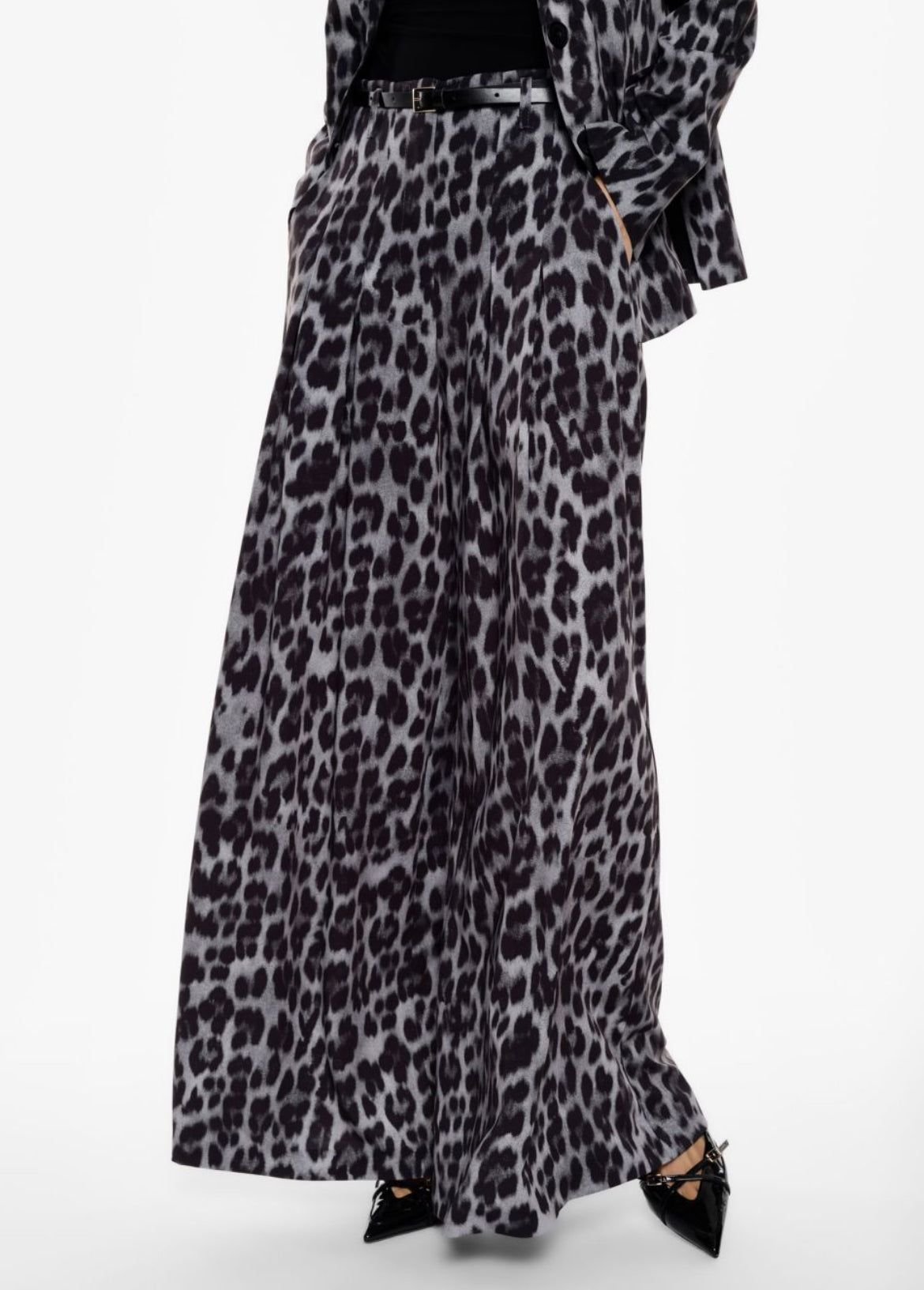 Estos pantalones estampados con animal print en tonos fríos y negro son ideales tanto para elevar conjuntos casuales como sofisticados. Incluyen un cinturón fino ajustable con hebilla metálica para definir la cintura.