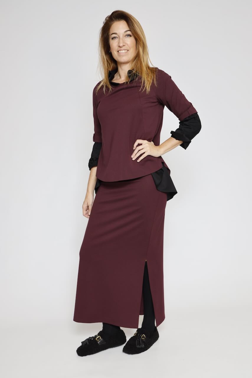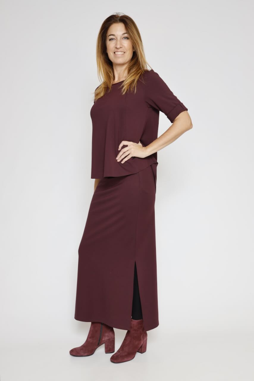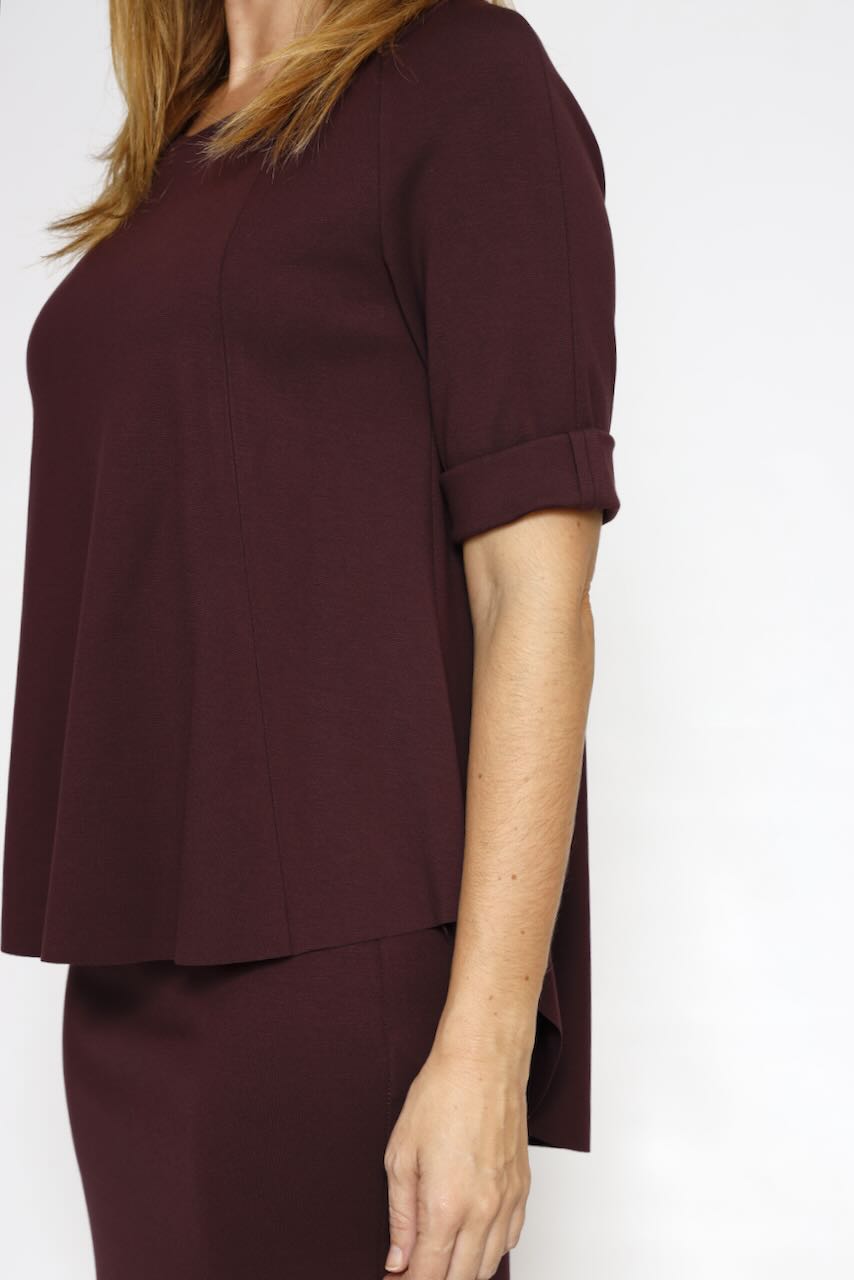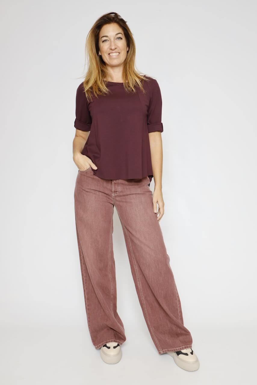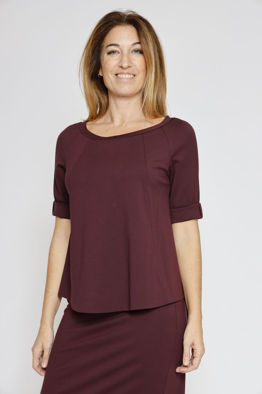 Esta camiseta acampanada está confeccionada en tejido de punto roma, ofreciendo un ajuste muy cómodo y versátil para cualquier ocasión.