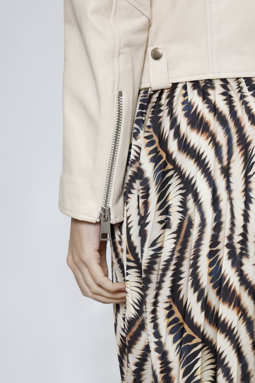 ¡Luce con estilo y comodidad esta cazadora de cuero en color beige! Perfecta para un look biker urbano y moderno.