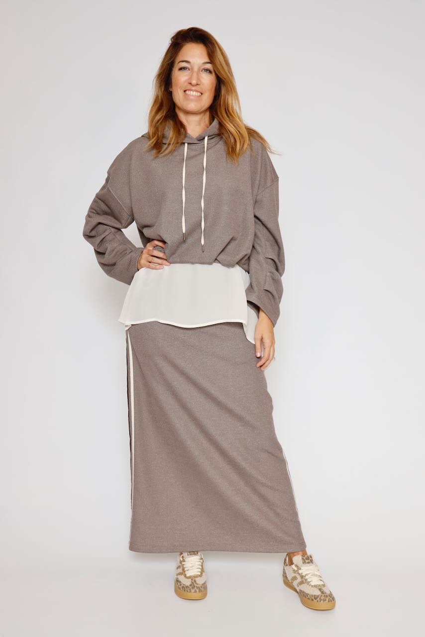 Esta falda de color marrón es perfecta para cualquier ocasión. Confeccionada con una mezcla de algodón, poliéster, viscosa y lurex, esta prenda es cómoda y elegante.