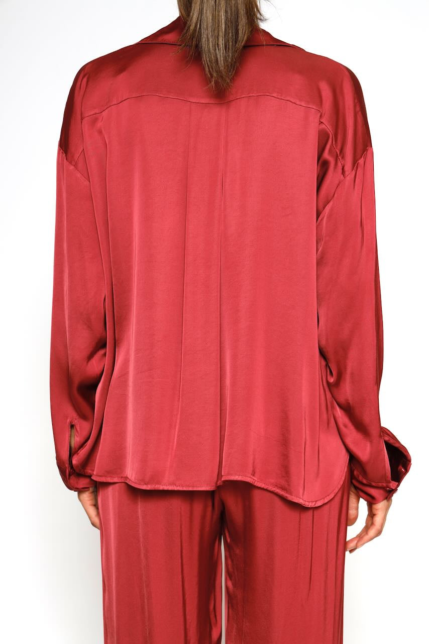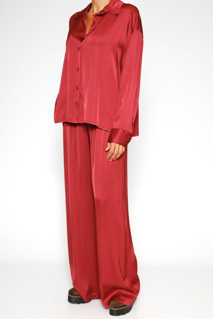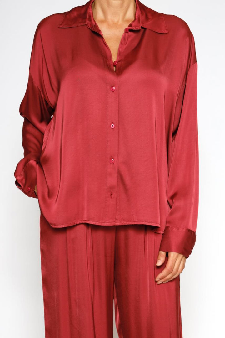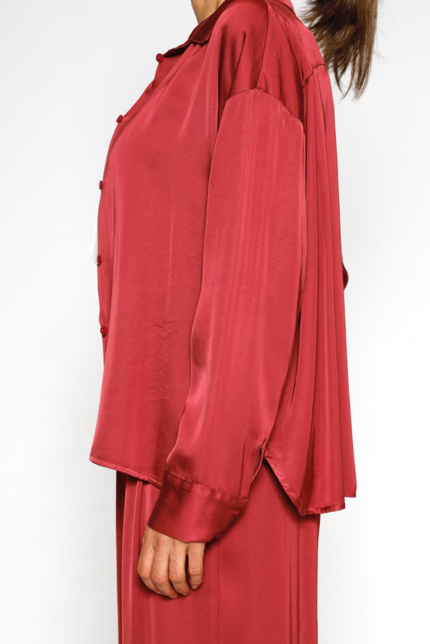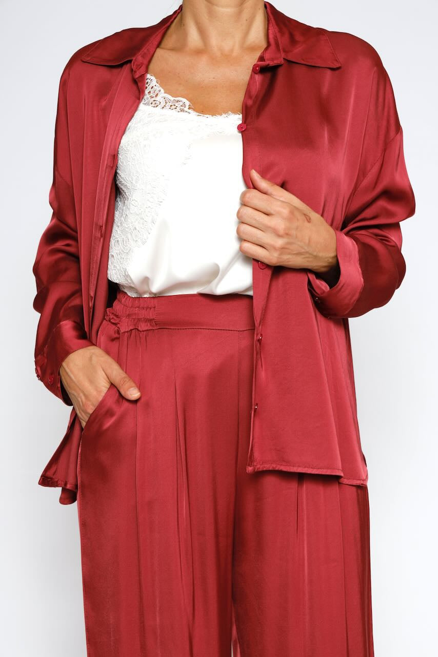 Esta elegante camisa granate está confeccionada con un tejido que emula la seda, ofreciendo un tacto suave y un aspecto lujoso.