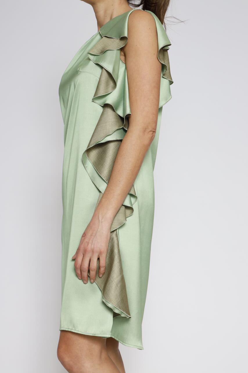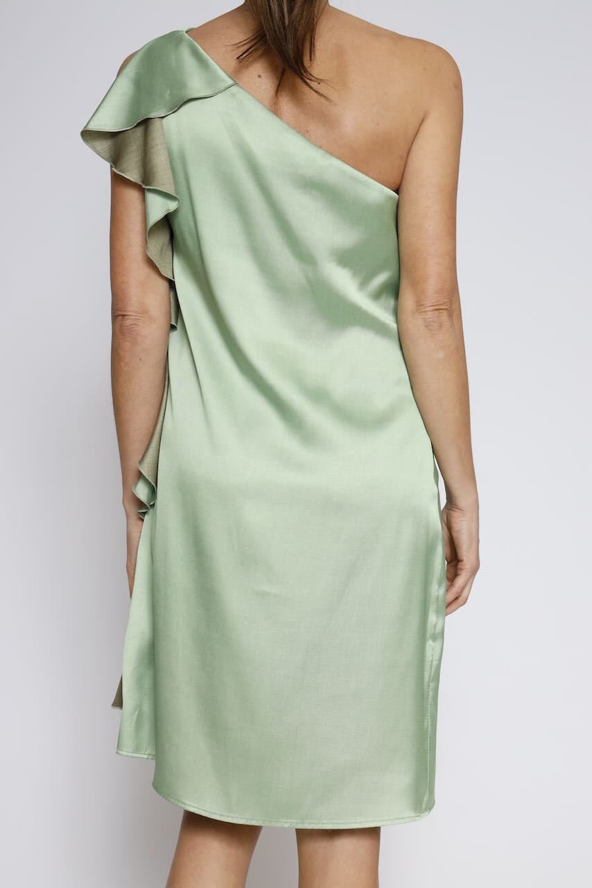 Este vestido está elaborado completamente en poliéster, un material resistente y fácil de cuidar. Su color verde vibrante le da un toque único y llamativo.