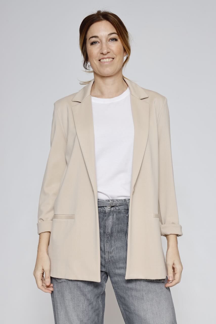Esta chaqueta americana en color beige es la prenda perfecta para darle un toque elegante a tu outfit. Confeccionada con una mezcla de viscosa, poliamida y elastán, garantiza comodidad y estilo en cada ocasión.