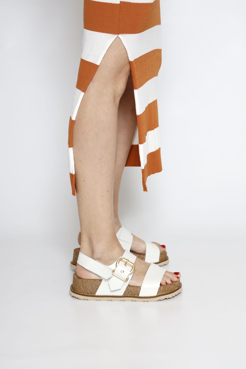 Vestido de rayas en color teja, perfecto para ocasiones casuales o formales.